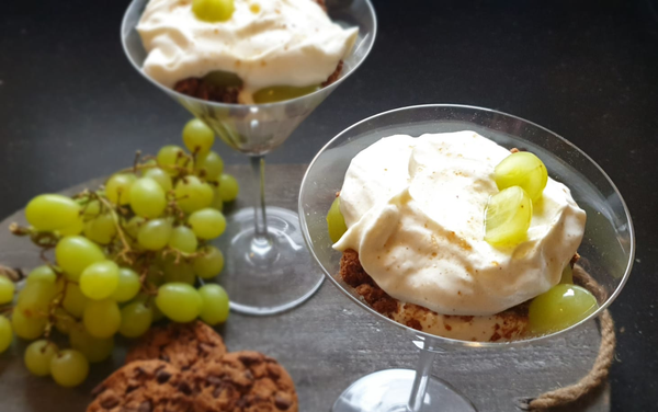 Nun in eine Schüssel oder in Gläser Schichten: Zuerst die Cookies, dann die Weintrauben und die Creme darüber geben. Das Ganze wiederholen und mit etwas süßer Verführung aus der Mühle bestreuen!